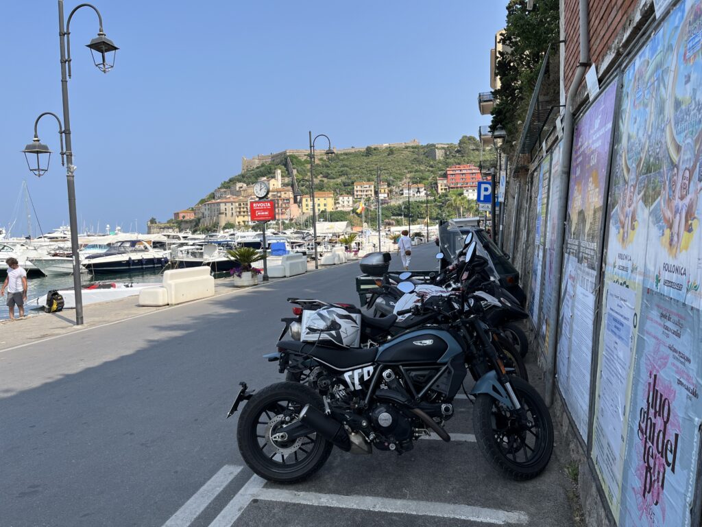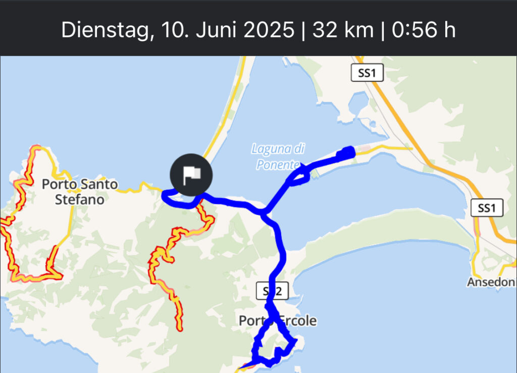 Auch heute lassen wir es ruhig angehen. Chillen und Planschen ist angesagt. Gegen Nachmittag starten wir zu einer kleinen Tour nach Porto Ercole in der Hoffnung auf Eis und Pizza. Haben wir schon mal irgendwo die säuische Fahrweise erwähnt?! Aber SB steht dem in nichts nach und hat gleich zweimal Glück in einer falsch angefahrenen Haarnadelkurve nicht umzukippen… peinlich.