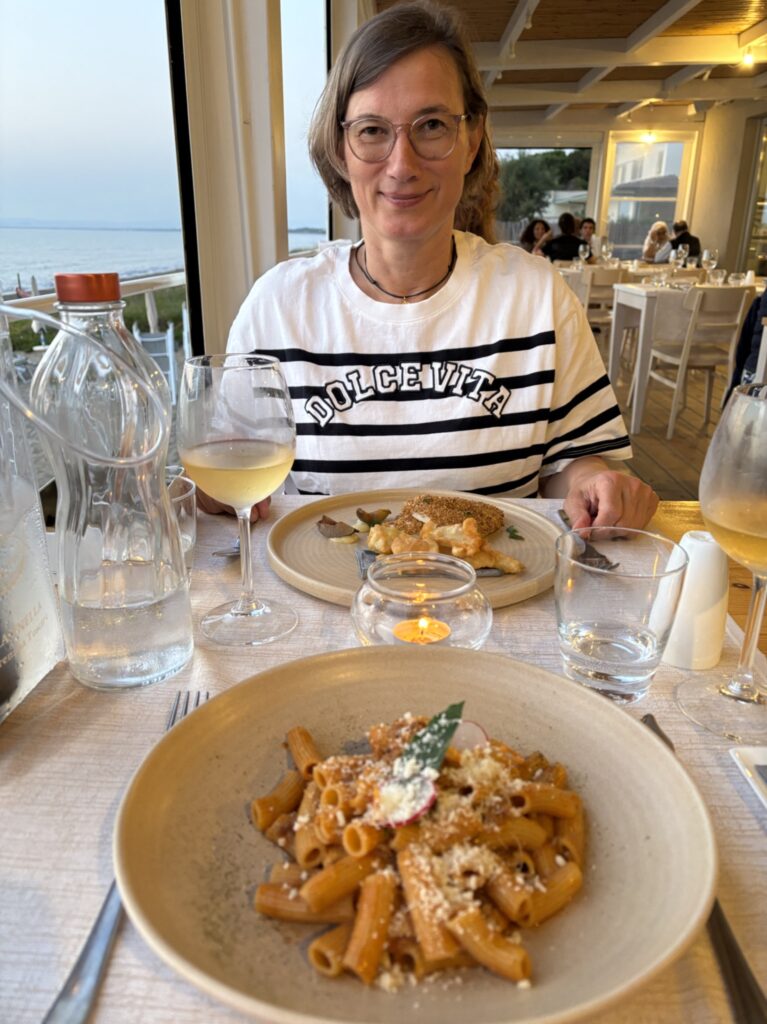 Dann hängen wir wieder auf dem Balkon rum, dösen und nachmittags snacken wir in der Strandbar. Am Abend düsen wir schnell über den zweiten Landarm nach Orbetello.