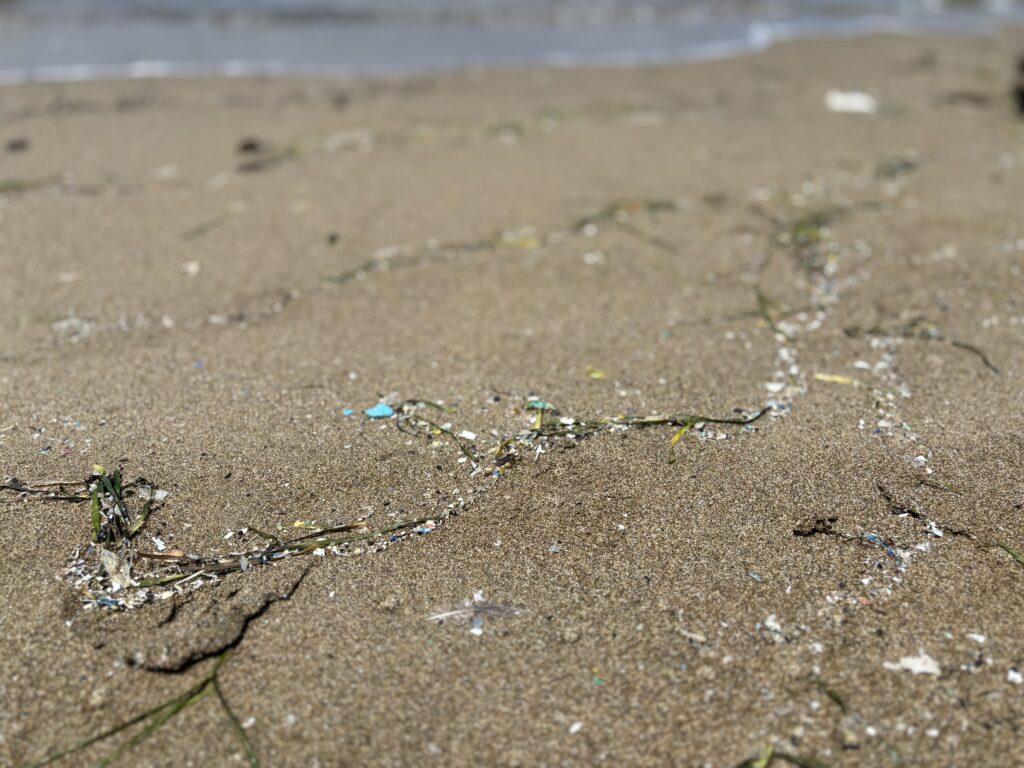 Deutlich sichtbar ist auch das angeschwemmte Mikroplastik. Kleine Plastikteilchen, die langsam mit dem Sand eins werden durch mechanischen Abrieb und wohl irgendwann in unsere Nahrungskette gelangen.