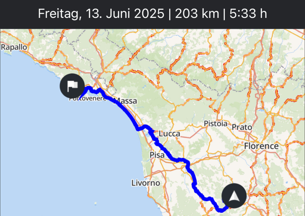 Wir haben in allen unseren Motorradurlauben zusammen nicht so viele gefährliche Situationen erlebt wie hier. Heutiges „Highlight“: in einem Tunnel vor La Spezia kommt uns ein PKW auf unserer Fahrspur entgegen. Nicht nur kurz, sondern lange und auch durch unser Hupen wird der Kurs nicht korrigiert. Das war… knapp… uns pulsiert es in den Adern bis in den Helm. Und das war nur das Highlight. Sie fahren hier auf Zwei- und Vierrädern einfach unterirdisch und rücksichtslos.