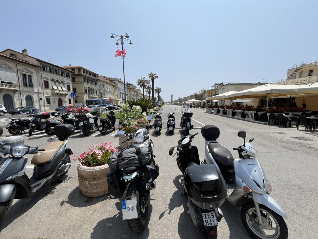 Also kehren wir ins nächste Ristorante ein, denn es sind 32 Grad und wir müssen trinken und essen. Danach geht es über Bürgersteig und Zebrastreifen wieder weiter (die Moto-Parkplatzausfahrt ist zugeparkt). Es folgen 20 Kilometer Strandbad an Strandbad an Strandbad. Alles verbaut und vom Meer keine Spur zu sehen.