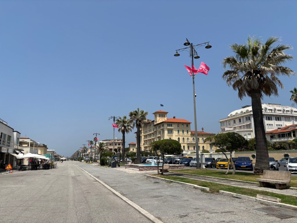 Wir steuern durch eine endlose Zahl Kreisel den Ort Viareggio an. Ein großes Seebad, wo wir uns irgendwie naiv einen Blick aufs Meer erhoffen. Stattdessen reihen sich private Badeanstalten kilometerlang aneinander und man muss Eintritt zahlen, um an den Strand zu kommen. Nur gelegentlich sind öffentliche Zugänge möglich. In zweiter Reihe kommmen Geschäfte und in „dritter Reihe“ die Straße. Das sieht dann von oben wohl so aus (Shutterstock):