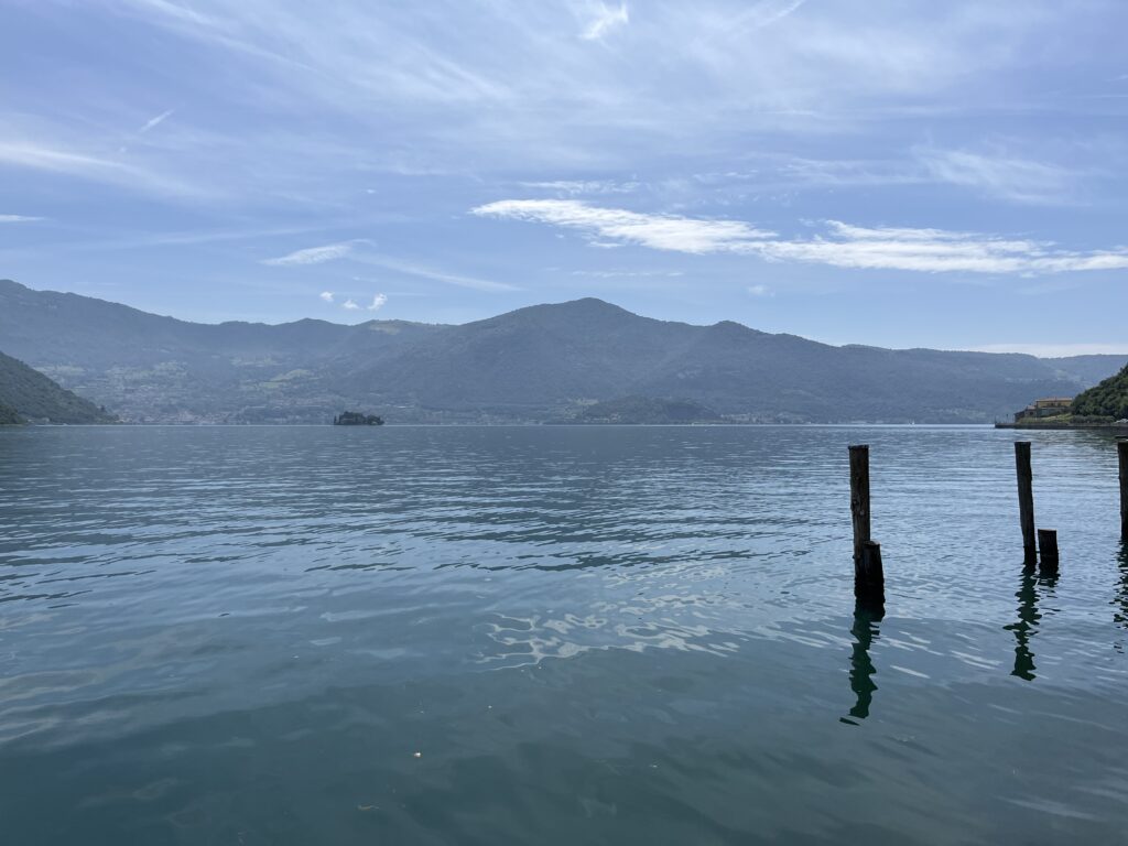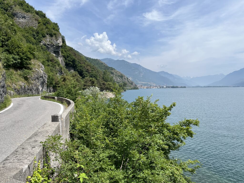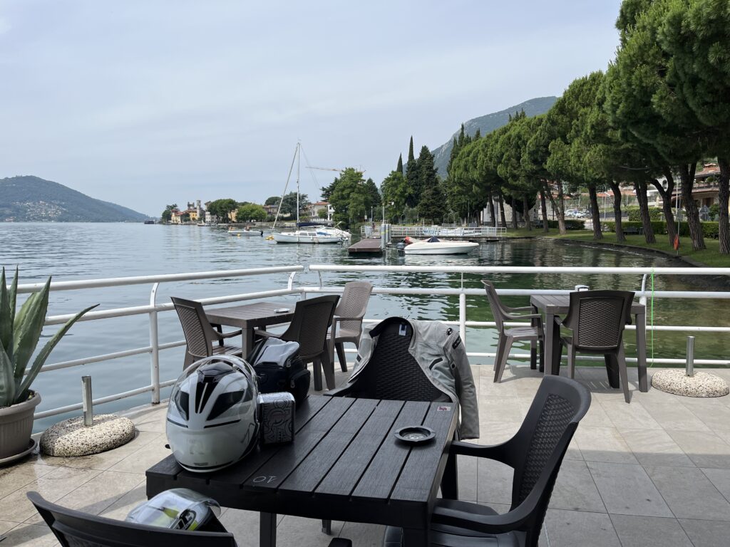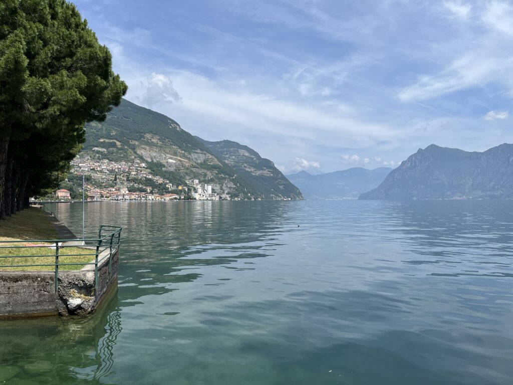 Es geht entlang von Agrarflächen und durch Chiari bis an das Südende des Lago d‘Iseo und dann am Westufer weiter. Der See selber sowie die Ortschaften sind kleiner und somit auch entspannter als der Gardasee. Wir gönnen uns eine Kaffeepause am See, der genau wie der Gardasee sehr klares Wasser hat.