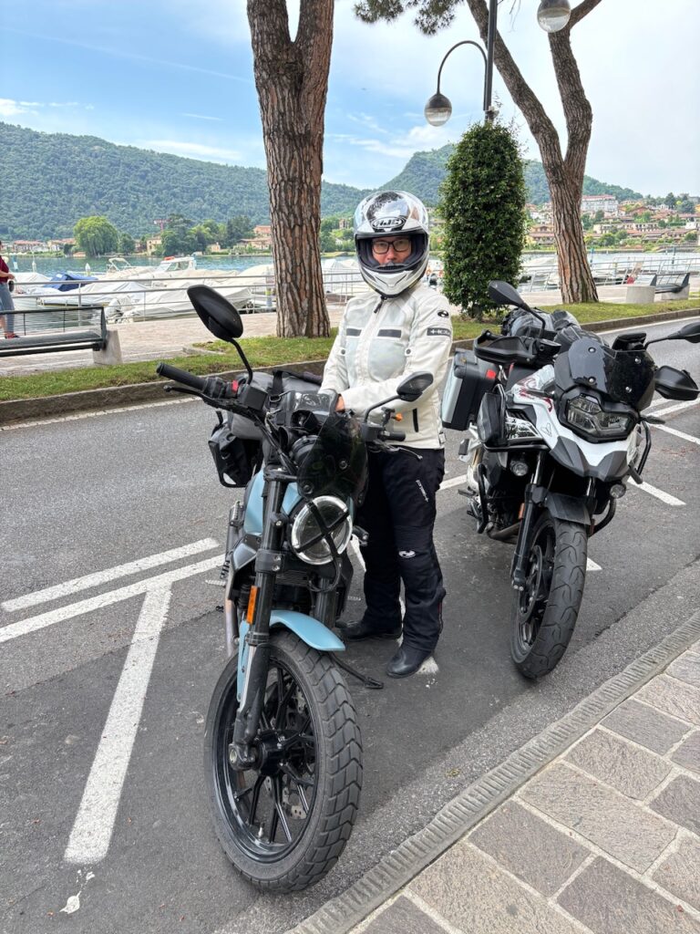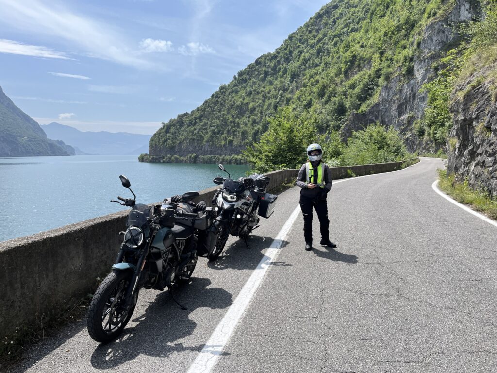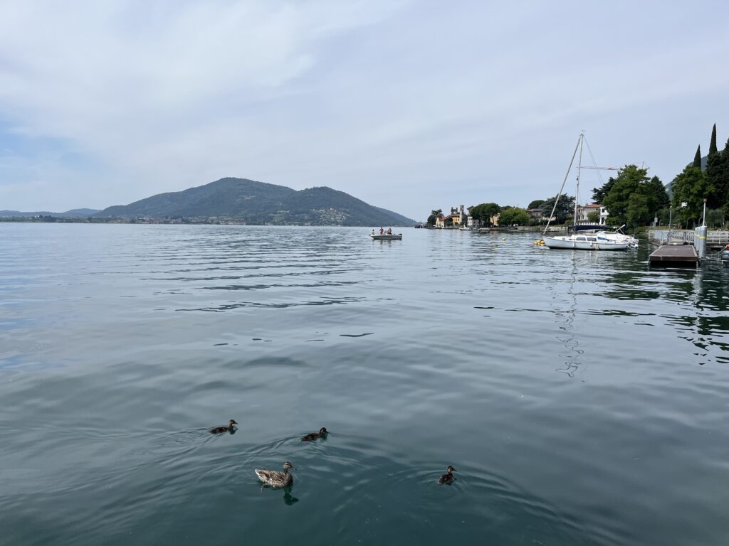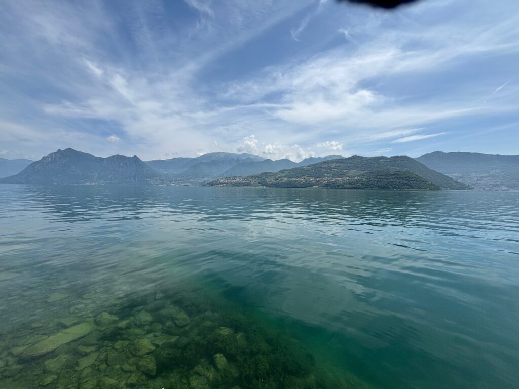 Es geht entlang von Agrarflächen und durch Chiari bis an das Südende des Lago d‘Iseo und dann am Westufer weiter. Der See selber sowie die Ortschaften sind kleiner und somit auch entspannter als der Gardasee. Wir gönnen uns eine Kaffeepause am See, der genau wie der Gardasee sehr klares Wasser hat.