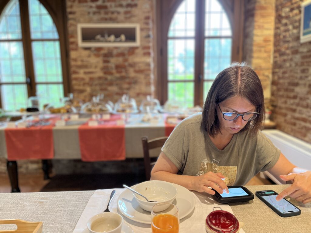 Für das Urlaubs-Protokoll gehört auch erwähnt, dass SB beim Frühstück (hier italienisch mit einer großen Keks- und Kuchenauswahl) immer die Tagesroute in das TomTom Navi-Gerät eingibt. Die Vorlage dafür kommt von Calimoto – der Navigations-App mit der SL reist. Da die Routenübertragung NIE reibungslos funktioniert, gehören auch immer 10 Minuten Gefluche und schlechte Laune von SB dazu. Das wiederum löst inzwischen schon Urlaubsgefühle bei SL aus 😂.